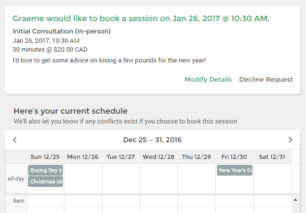 When your clients request sessions, you can either accept with one-click or refer to your schedule to adjust the day and time without leaving the page!