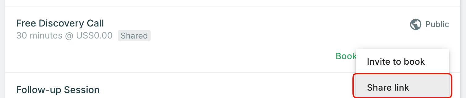 Use this option to create a button (e.g. "Book Now") on your website, sales page or even to share a booking link right from your Newsletter or Social Media. This link will redirect clients to your calendar specifically for this service/package:
