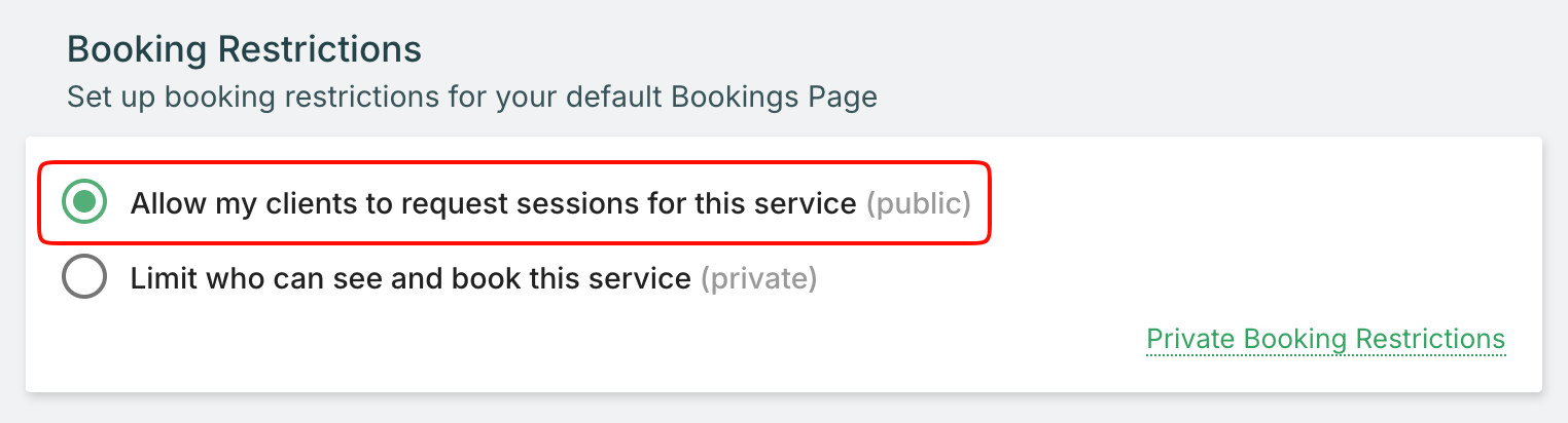 Your default Bookings Page displays all services, packages, and programs set to public. You can customize the visibility of each offering individually — some can be public while others remain private. Public offerings appear automatically on your default bookings page, while private offerings do not.