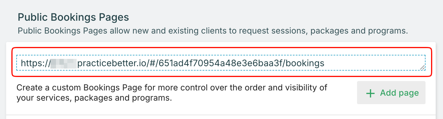 - Use a link to your default Bookings Page. Your default Bookings Page will display all public packages, services, and programs for your client to book.