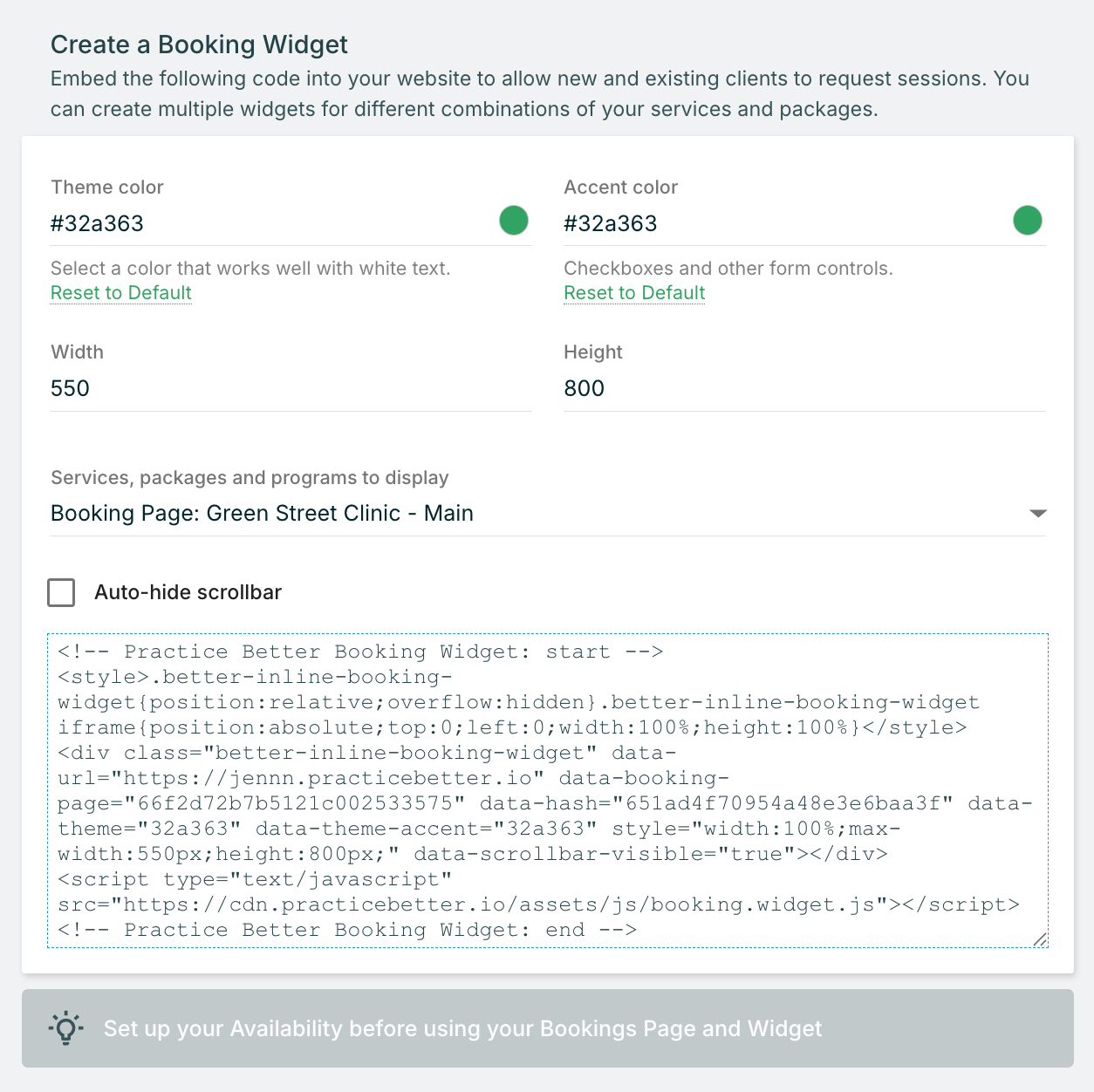 If you'd like to keep your clients on your website, you can also embed the bookings widget HTML code.