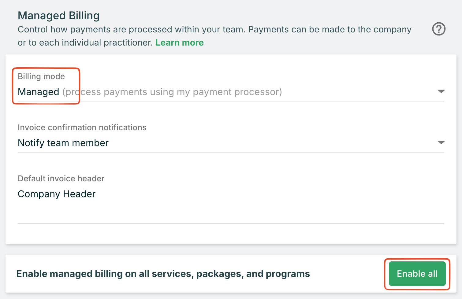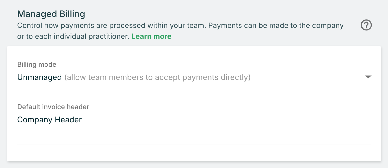 If you operate a group practice, Managed Billing gives you control over payment processing across your entire team. You can choose whether payments flow to a central company account or directly to individual practitioners, supporting whatever financial structure works best for your practice.