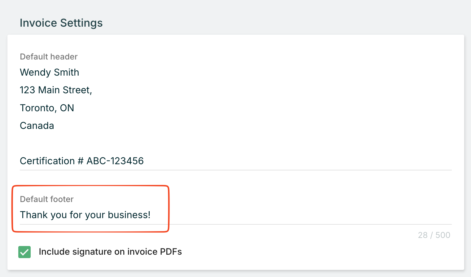 This information appears on every invoice, making it easy for clients to reach you with questions.