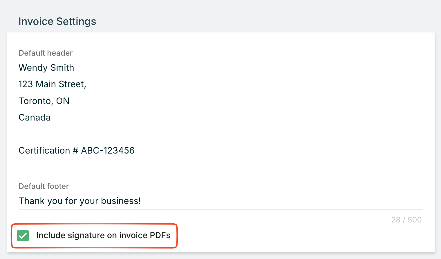 - Under Invoice Settings, enable the PDF Signature option.