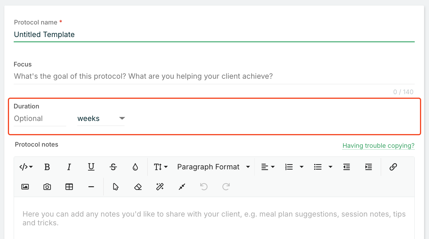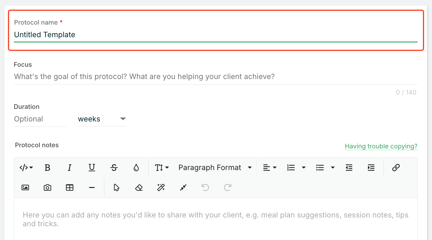 📍 Note: Editing a protocol template doesn't automatically update protocols already sent to clients. Each client protocol is a standalone document, ensuring that changes to your templates don't unexpectedly alter active client care plans.
