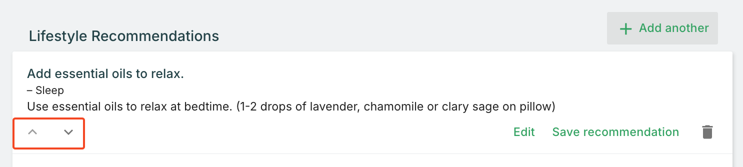 After adding recommendations, you can adjust their sequence using the up and down arrows on each recommendation. This lets you organize recommendations in the order that makes most sense for your client's journey.