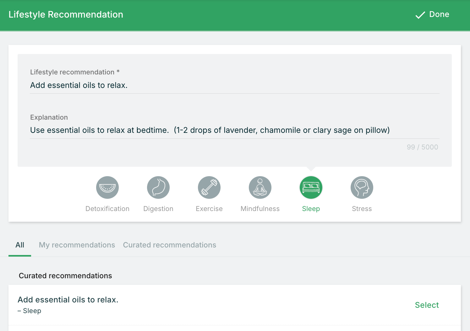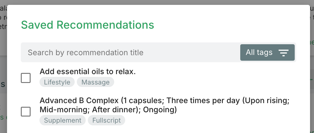 Saved recommendations are simply recommendations you originally created inside a protocol and chose to save for reuse, building a personal library of your most commonly prescribed supplements, foods, or lifestyle practices.