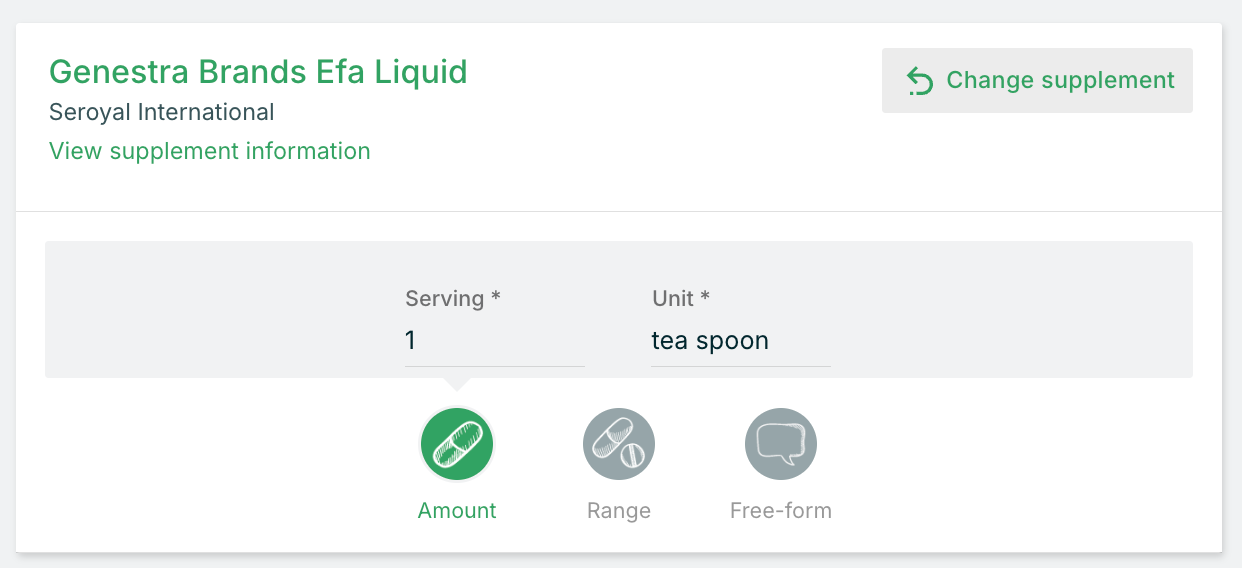 Enter the recommended serving as either a specific amount, a range, or free form instructions. Different dosage options may be displayed depending on the material of the supplement (liquid, capsule, etc.).
