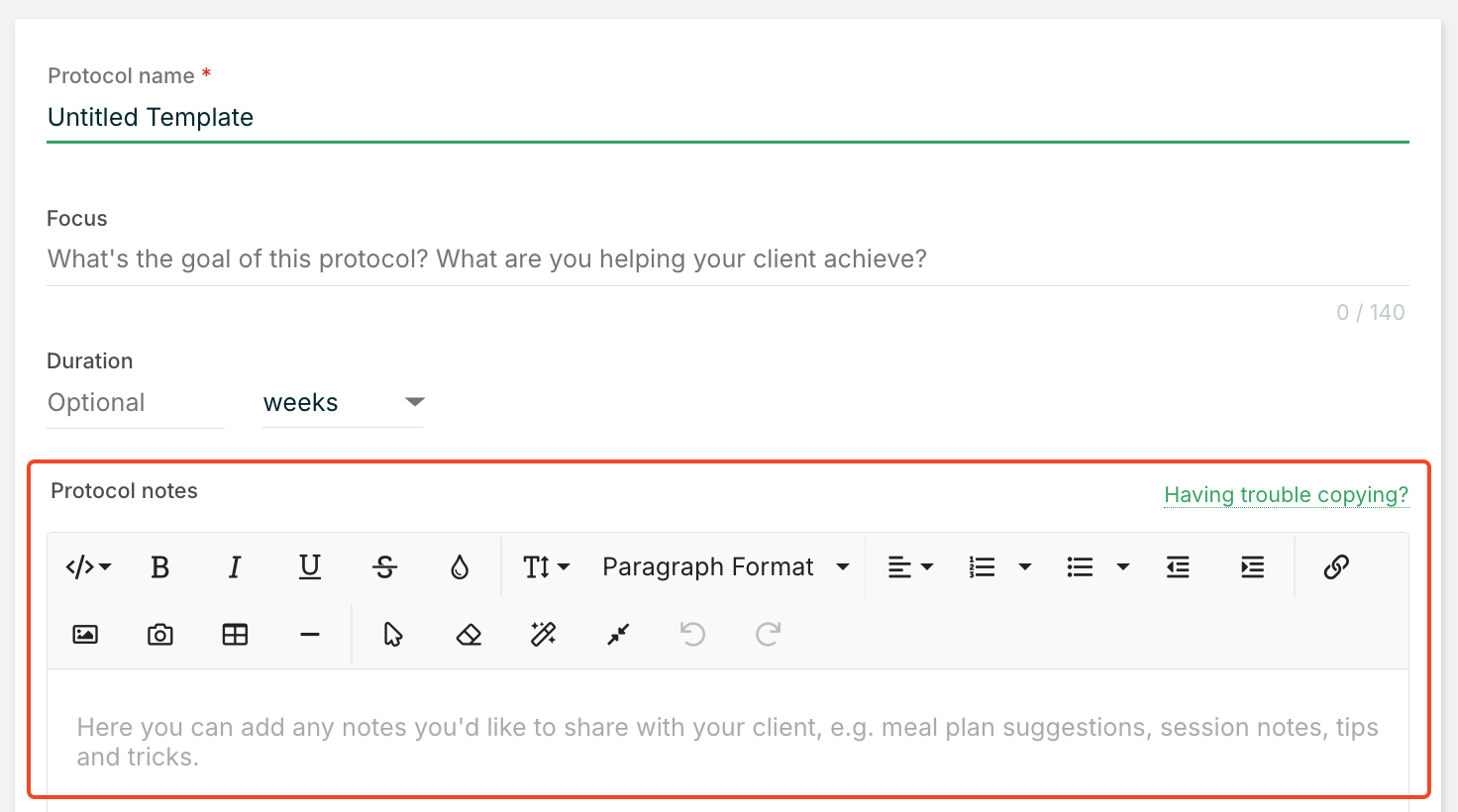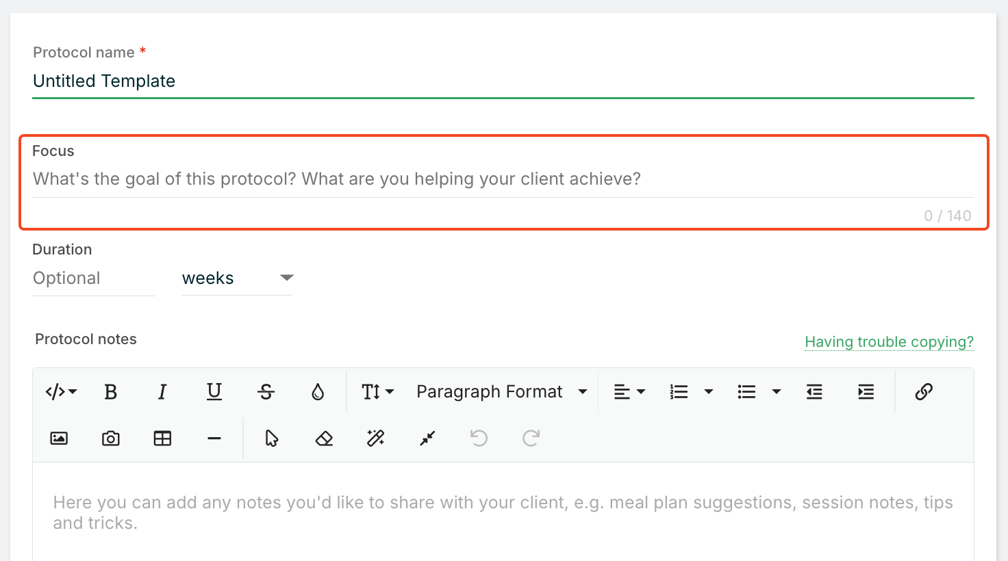 - Write a description in the Protocol notes explaining how this protocol will benefit the client and what outcomes to expect.