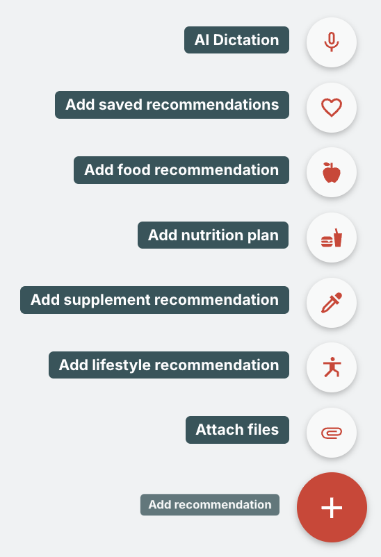 Food recommendations allow you to specify dietary changes by categorizing foods your client should include, exclude, or reduce. This creates clear nutritional guidance tailored to their health goals.