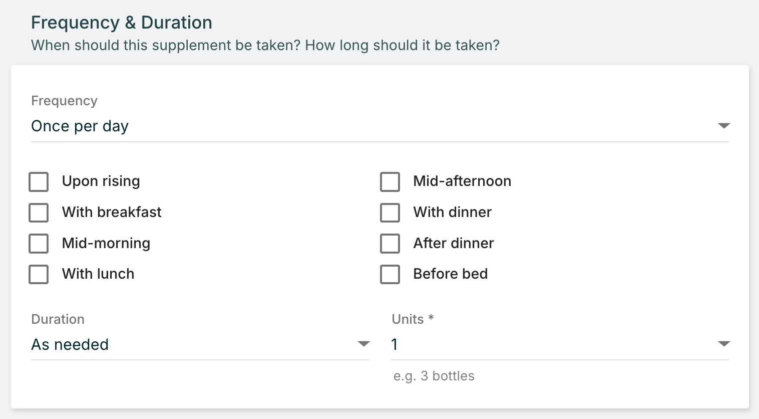 Practice Better provides structured options for supplement timing through the Frequency & Duration section when adding supplement recommendations. You can specify: