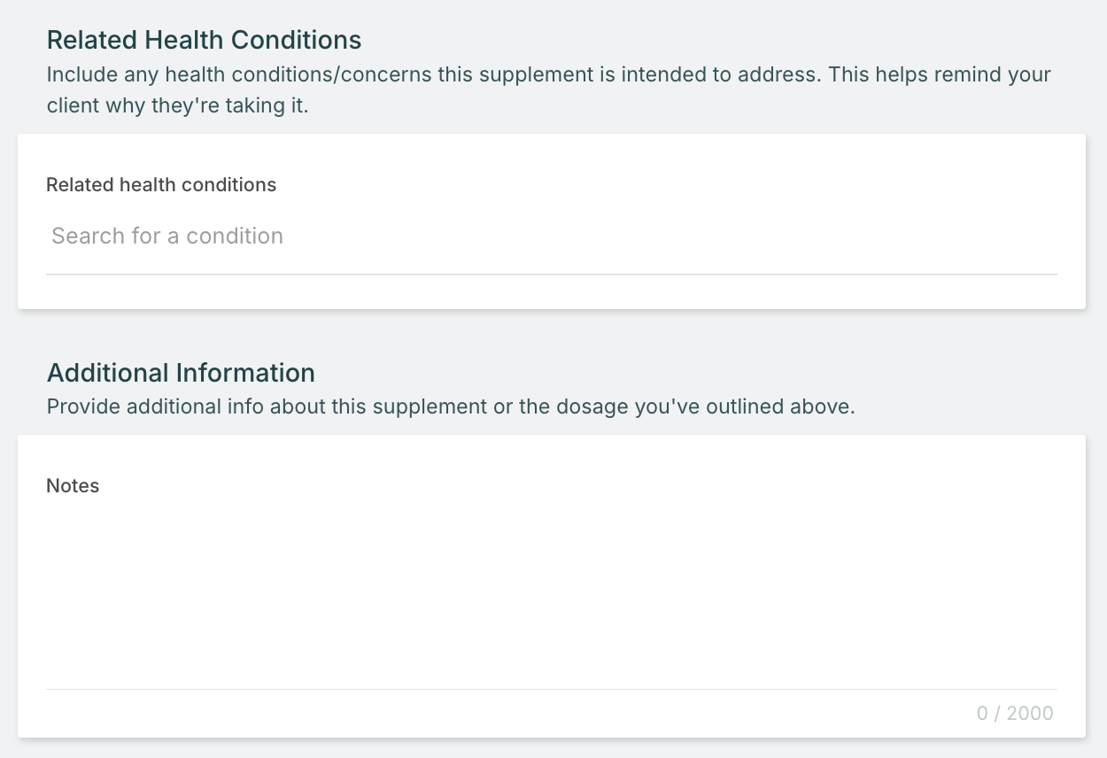 For supplement recommendations that require nuanced guidance, use the Additional Information field to add detailed directions. This field accommodates up to 2,000 characters, giving you ample space for:
