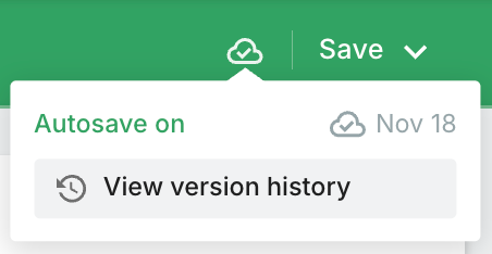Practice Better automatically saves your work as you go – click the cloud icon (autosave) near the top-right corner to view Version History if you need to access previous versions. Versions are stored for up to 60 days, giving you peace of mind when making significant changes.
