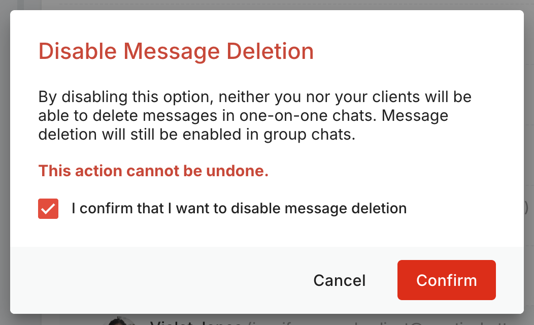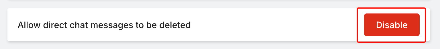 When the option to delete chat messages is enabled for your account, the team owner can find the button to disable it again by going to the bottom of your Settings > Telehealth & Messaging page.