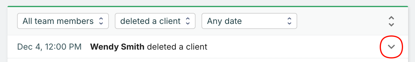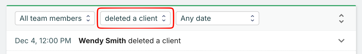 - In the All activity dropdown, search and select delete a client to filter the log.