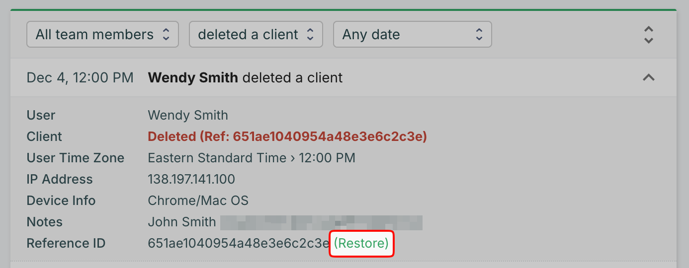 - Click Restore at the bottom of the entry. This option is available for clients deleted within the last 60 days.