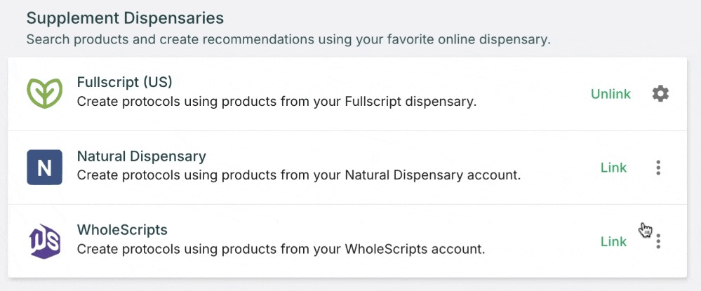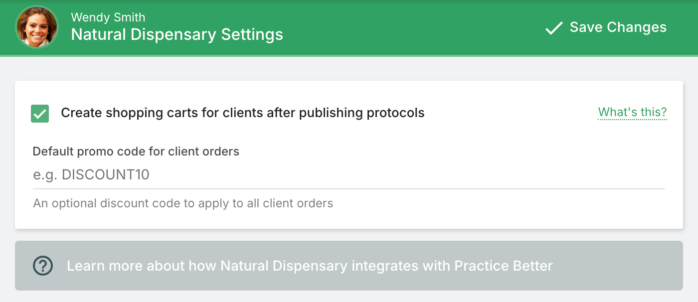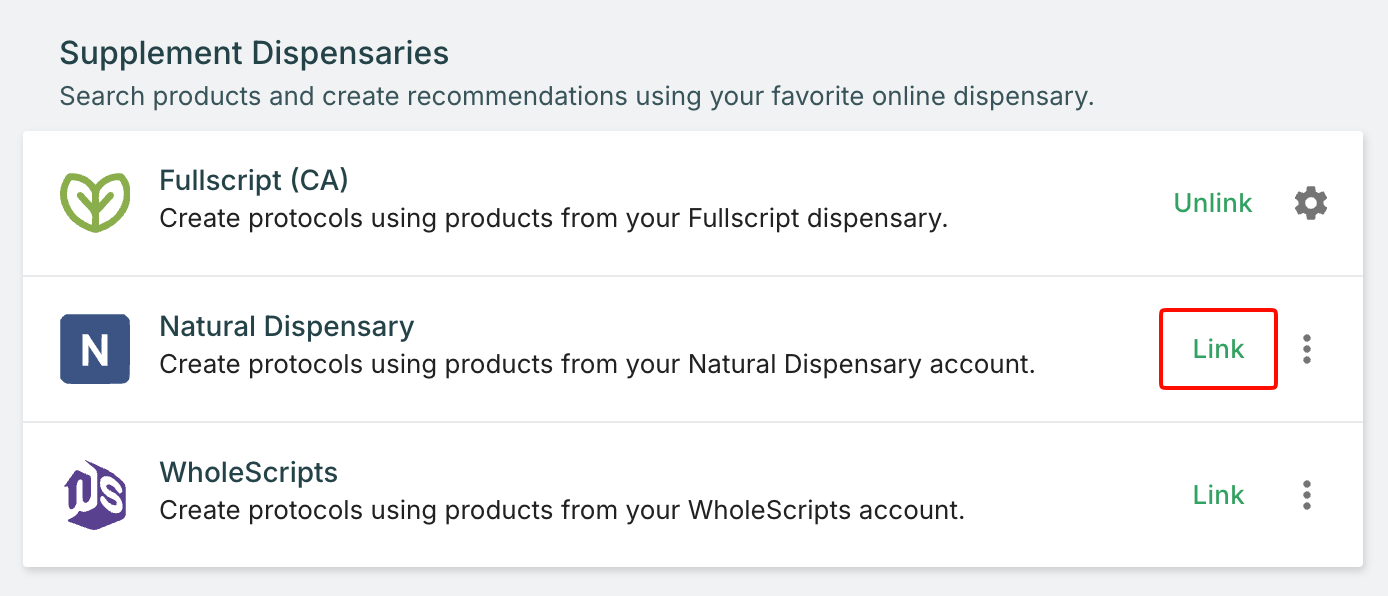 Connecting your accounts creates a seamless workflow between your Practice Better protocols and Natural Dispensary's product catalog. Each practitioner on your team will need to link their own personal Natural Dispensary account with their Practice Better account.