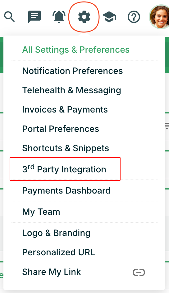 - Go to Settings > 3rd Party Integration by clicking the Settings & Preferences icon in the top-right corner of your portal.