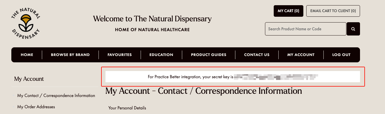 - A popup will appear requesting your Natural Dispensary email address and Practitioner Key. Locate your Secret Key on the My Account page in your Natural Dispensary account.