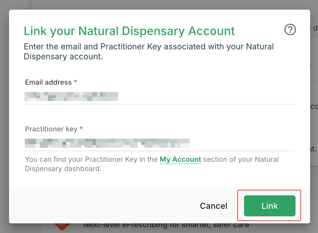 - Copy the key and paste it, along with your Natural Dispensary account email, into the pop-up in your Practice Better portal, then click Link to continue.