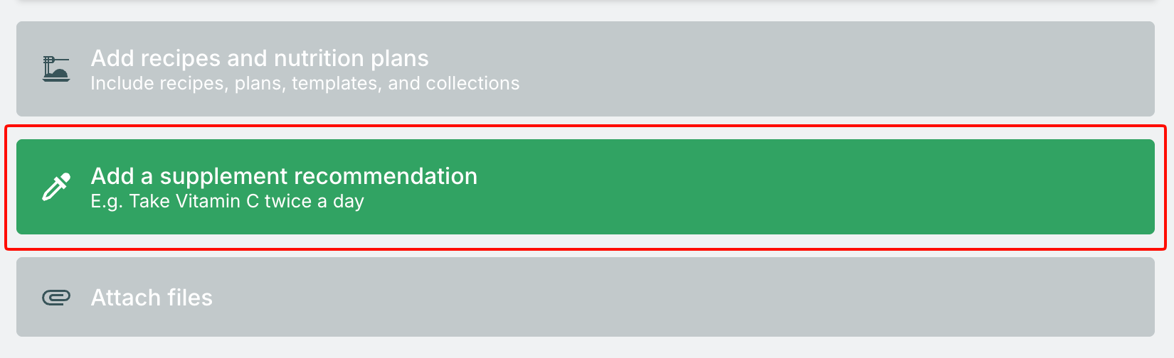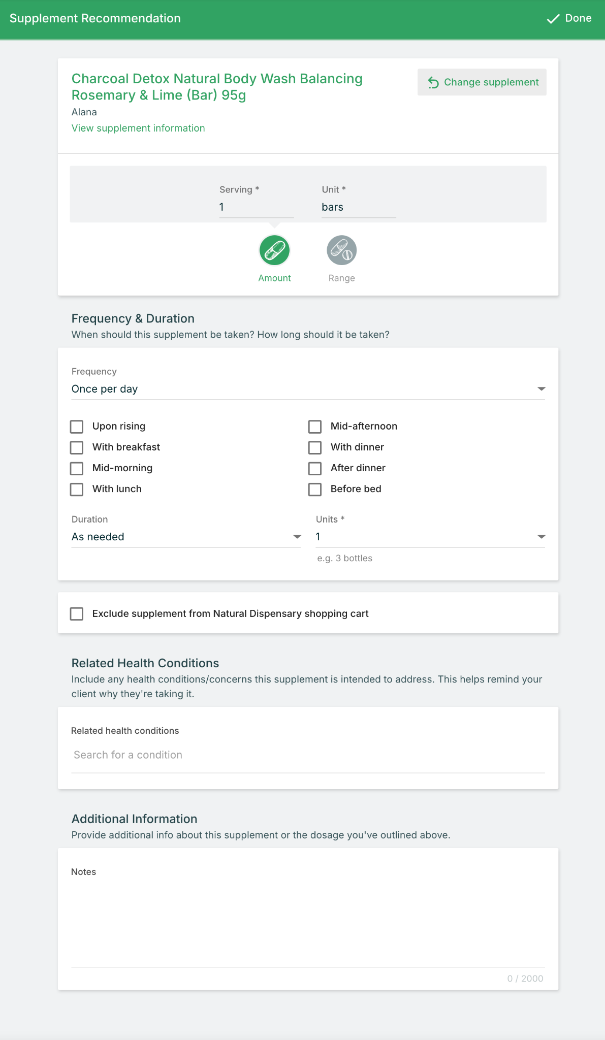 - After selecting a supplement, set the recommended dose, frequency, and duration based on your client's individual needs, and click Done near the top-right.