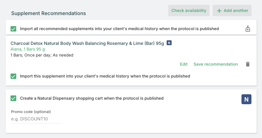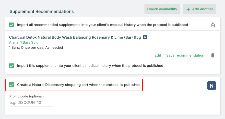 - Enable the option to Create a Natural Dispensary shopping cart when the protocol is published. You can apply a client discount at this stage by entering a promo code.