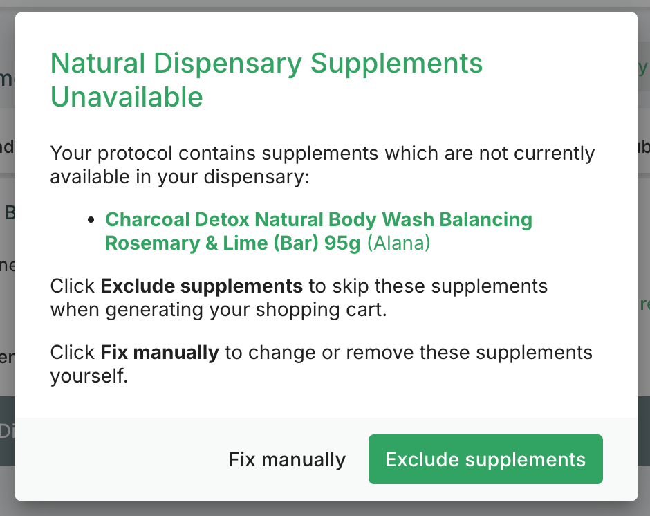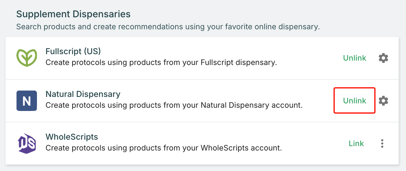 ⚠️ Important: If you unlink Natural Dispensary and then attempt to save Protocols that include Natural Dispensary supplements, Practice Better will display a warning message indicating incompatible supplement recommendations.