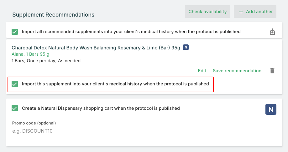 - Click the check box to Import this supplement into your client’s medical history when the protocol is published. Learn more about using the client record Medication and Supplement Tracker →