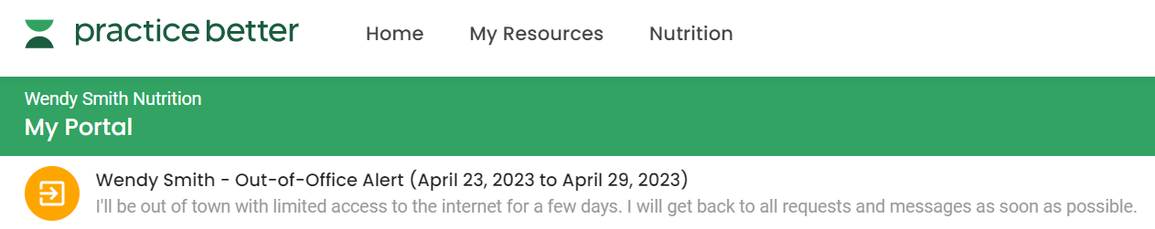 Clients will see a banner at the top of their Client Portal during an out-of-office period. Dates on your Bookings Page will also be disabled for the duration of your out-of-office period(s).
