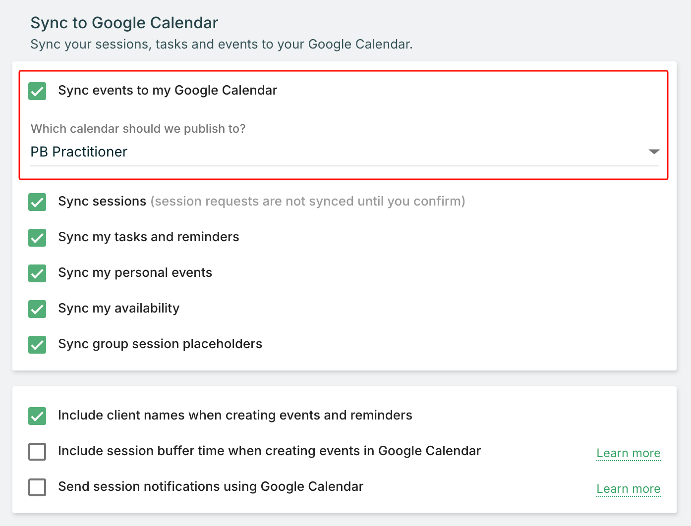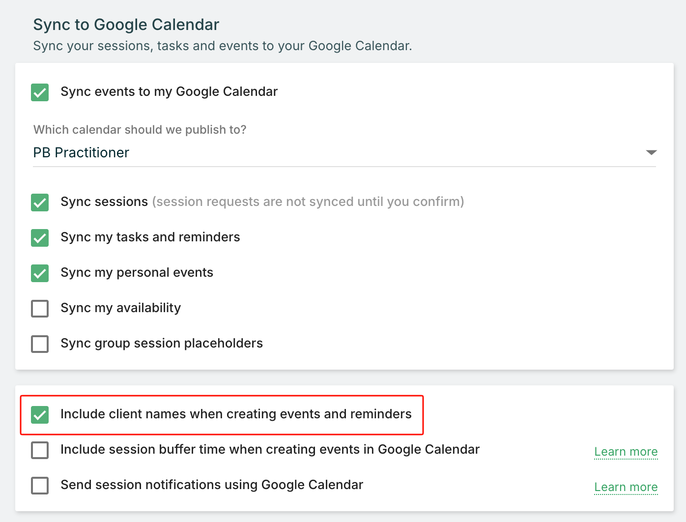 By default, client names are included when sessions sync to Google Calendar. Disable Include client names when creating events and reminders if you prefer not to have client information stored in your Google Calendar. After adjusting your settings, click Save Changes at the top of the page.