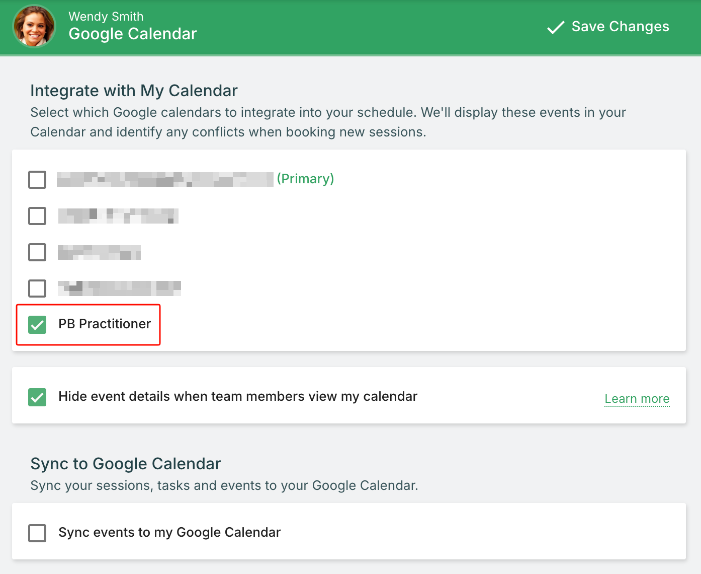 Under Integrate with My Calendar, select which Google calendars should be visible in your Practice Better schedule, and then Save Changes.