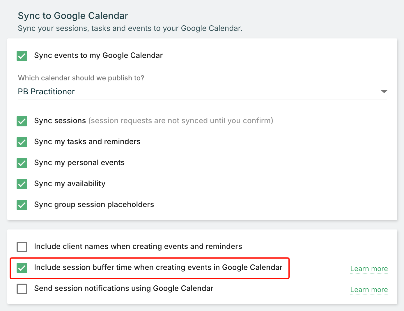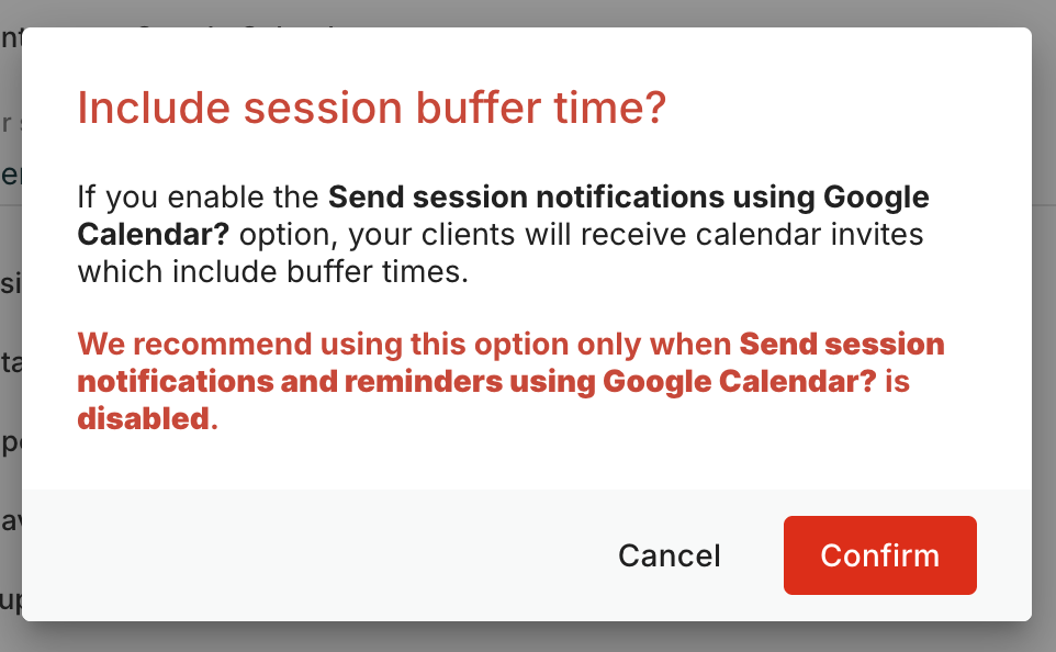 ⚠️ Important: If you enable Send session notifications using Google Calendar, your clients will receive calendar invites that include buffer time. Enabling both options together is not recommended. Practice Better recommends using Include session buffer time only when Send session notifications using Google Calendar is disabled.
