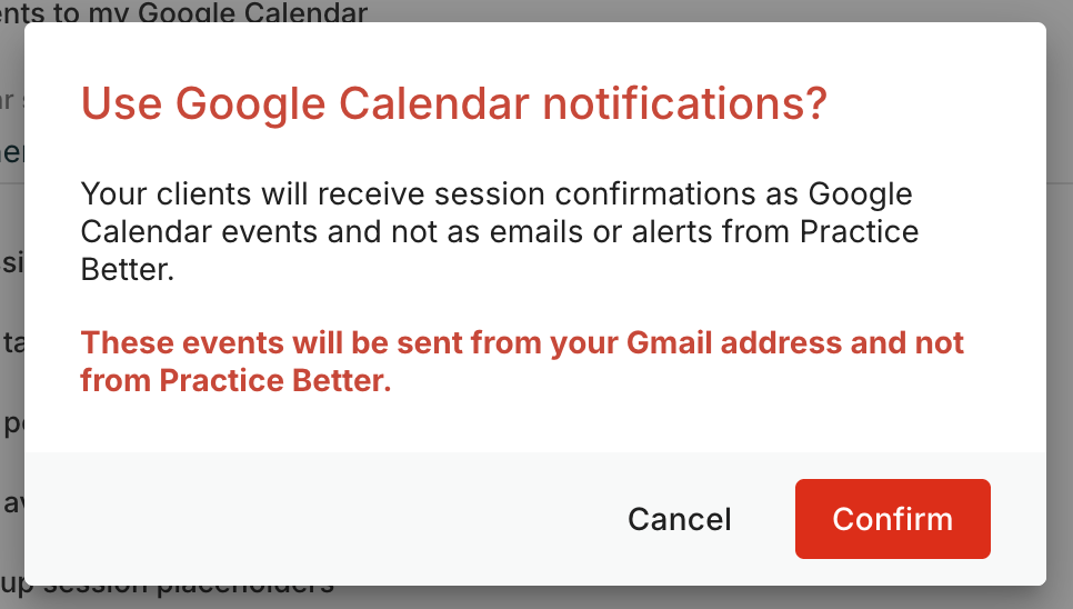 ⚠️ Important: When this option is enabled, clients will receive notifications from your Gmail address, not from your Practice Better business email. If you use a personal Gmail address, clients will see that address in the "From" field.