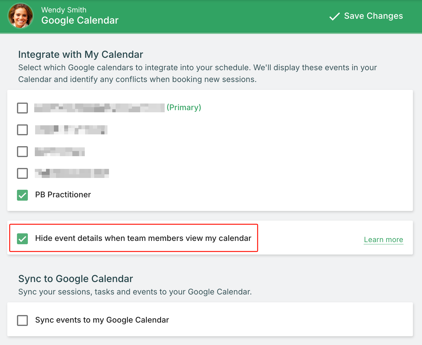 If you have team members who can view your calendar and book sessions on your behalf, you can enable Hide event details when team members view my calendar. When this is on, team members will see your Google Calendar events marked as "Free" or "Busy" only, without event titles or details. After adjusting your settings, click Save Changes at the top of the page.