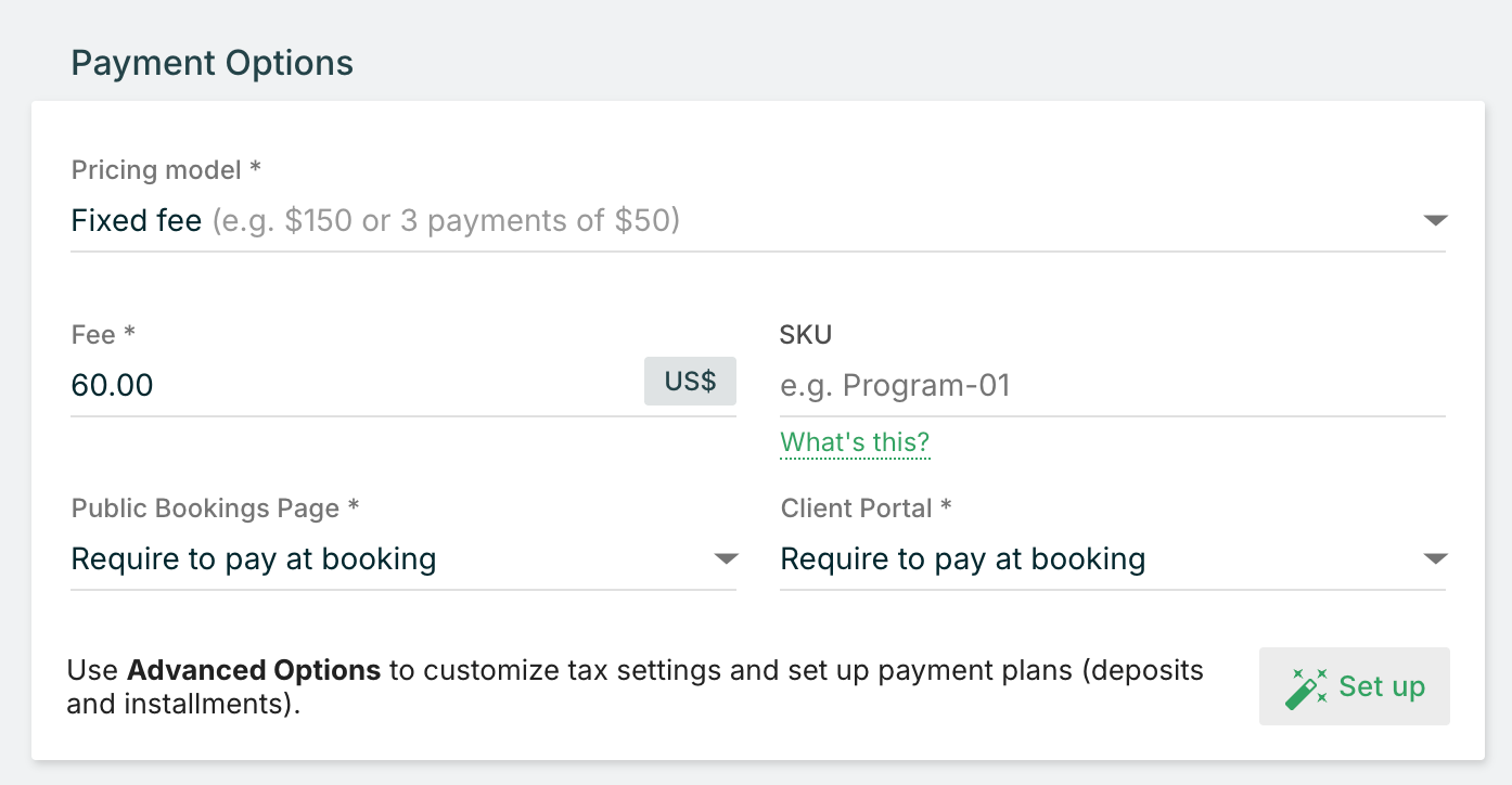 - Set up associated payment options. Learn more about Setting up Payment Plans for Packages, Programs and Services.