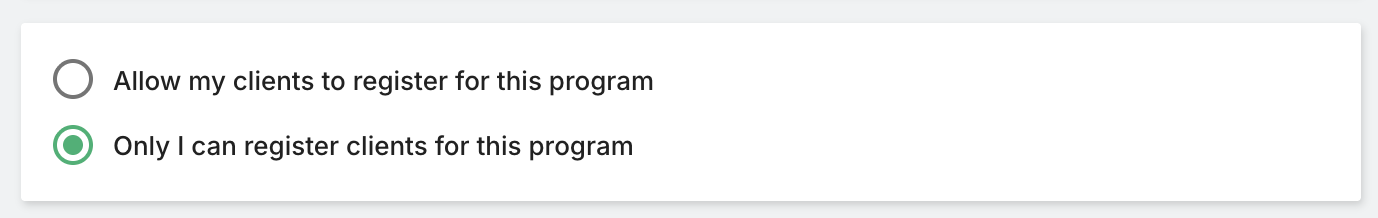Only I can register clients for this program: This will list the Program as “Private” in your list of Programs, and it won’t be listed on your uncustomized Default bookings page, but you can still add it to a custom bookings page.