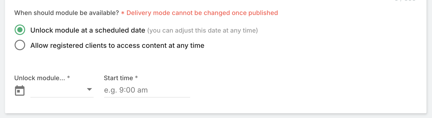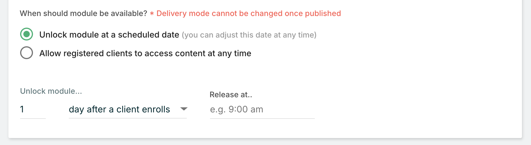 - Modules can either be scheduled or available immediately to clients upon registration. Select Allow registered clients to access content at any time to have a module unlocked at enrollment.