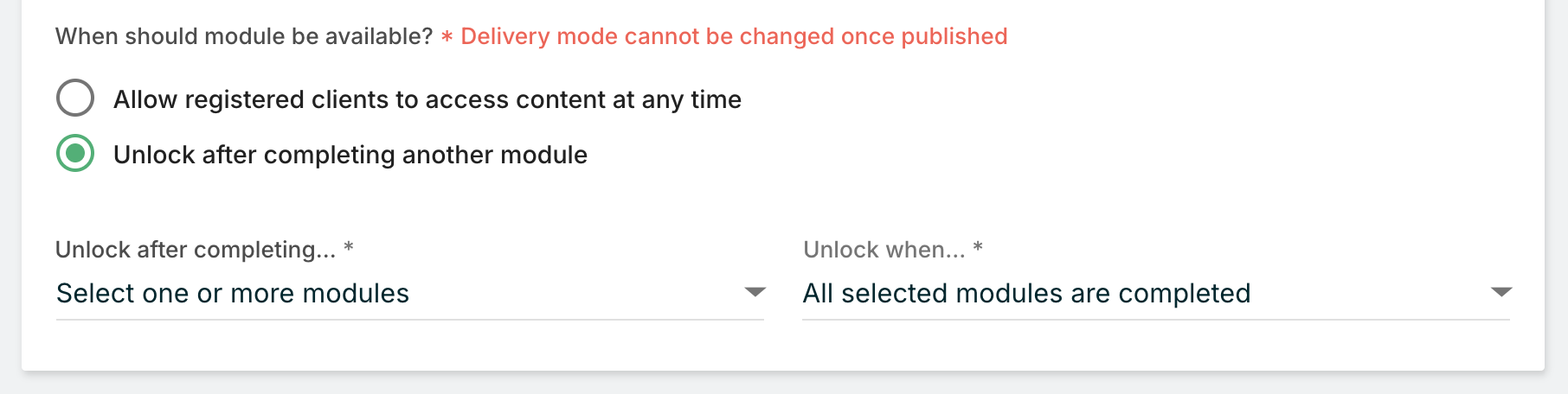 When building your modules, use the Unlock after completing... dropdown to select one or more prerequisite modules. Then use the Unlock when... dropdown to specify whether clients must complete at least one or all of the selected modules before accessing the current module.