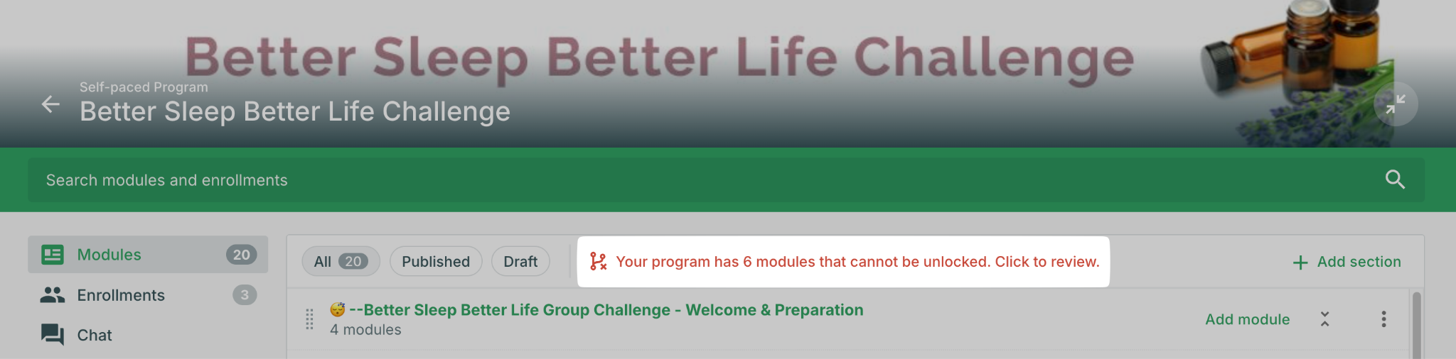 - Needs at least one module that is unlocked at enrollment. Select Allow registered clients to access content at any time to have a module unlocked at enrollment.