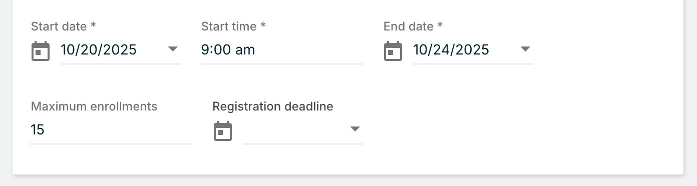 Fixed-Date only: Select your fixed start and end dates. Enter the number of maximum enrollments and the registration deadline (both optional).