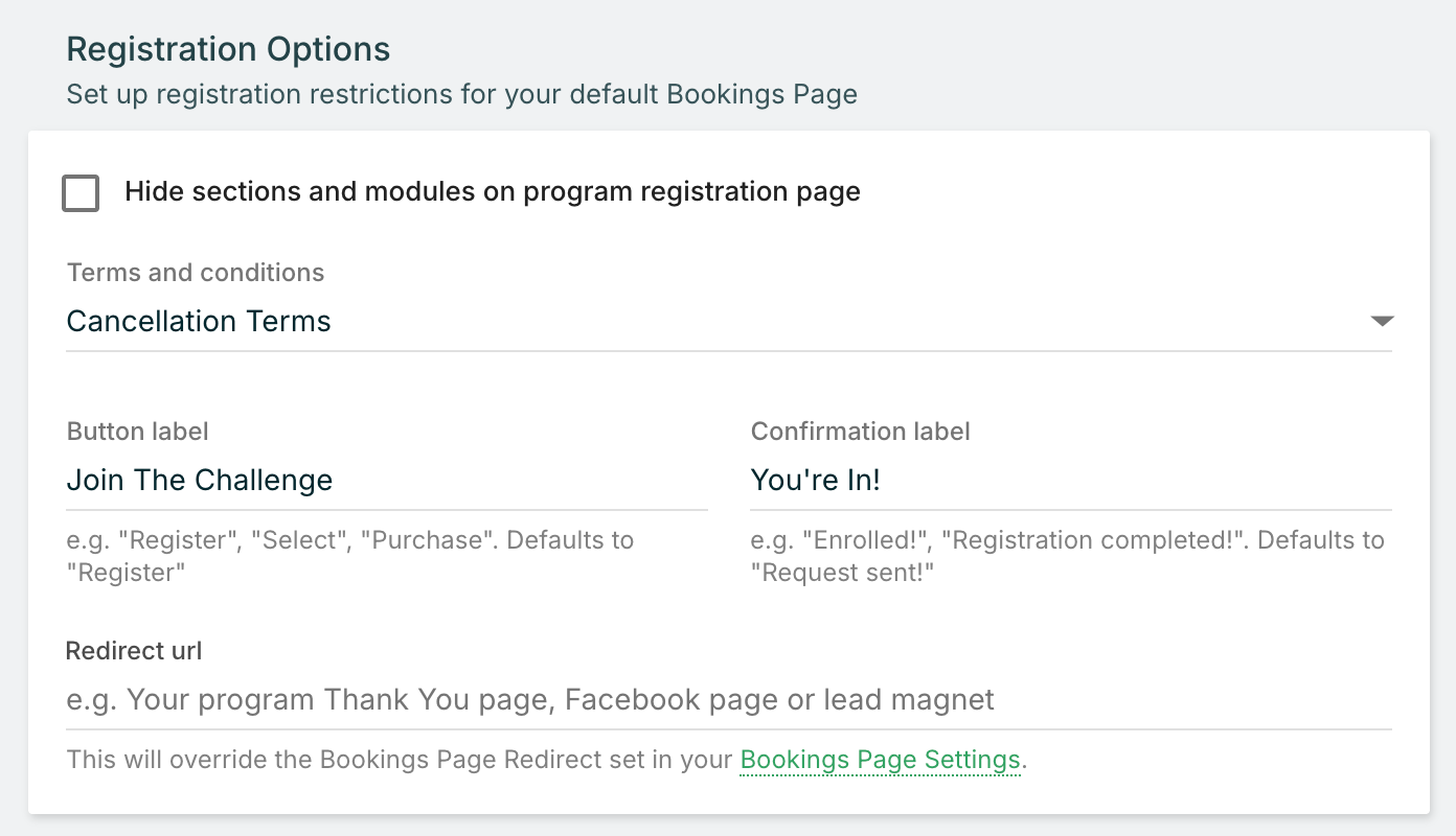 - Hide sections and modules on the program registration page: leaving this unchecked will display a list of the program contents on the public registration page.