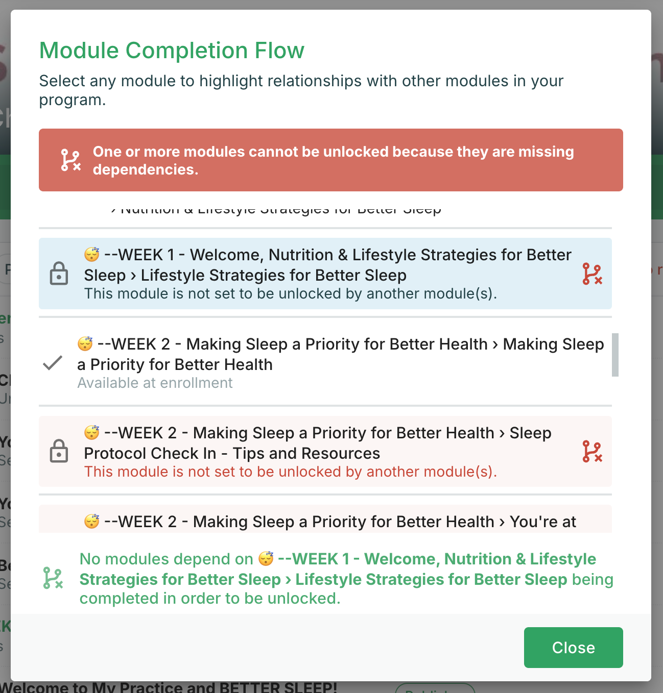 Click the completion flow indicator at the top of your Modules page to visualize your program structure. This feature displays how your modules connect and their individual dependencies. Click on any module for additional details about its unlock requirements.