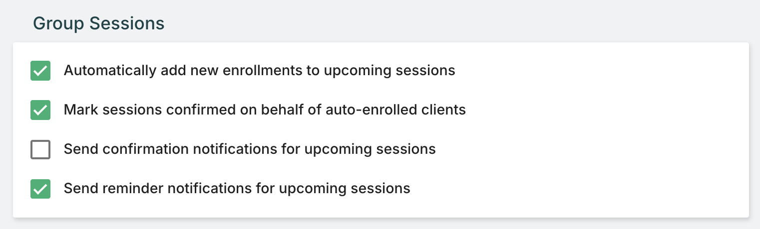 Group Sessions (Fixed-Date only): Configure group session settings to automatically add new enrollees and confirm their sessions. You can also enable or disable session notifications.