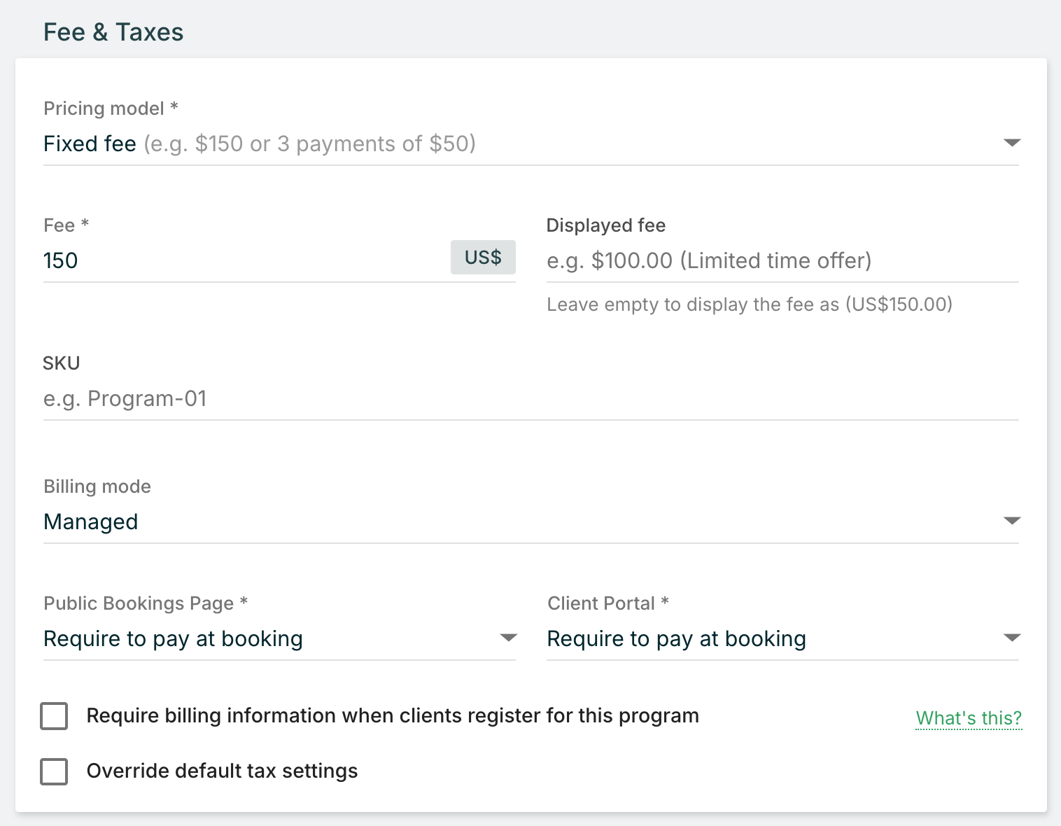 Fee & Taxes: Set program pricing (fixed or payment plan), fee, currency, and optional promotional display. Add a SKU if needed. Set billing mode as Managed or Unmanaged (Team plan only). Choose payment requirement for public bookings or client portal, and optionally require billing info at registration or override tax settings.