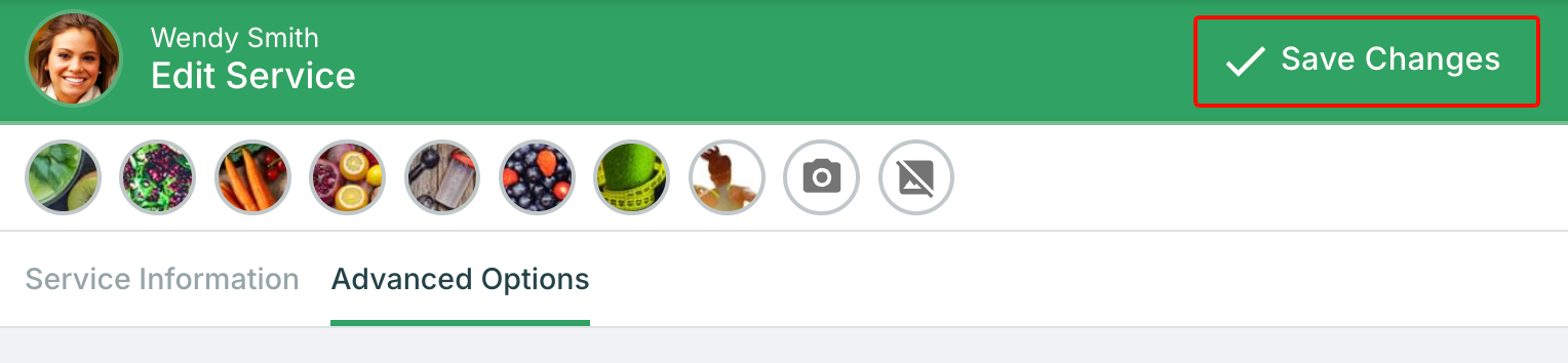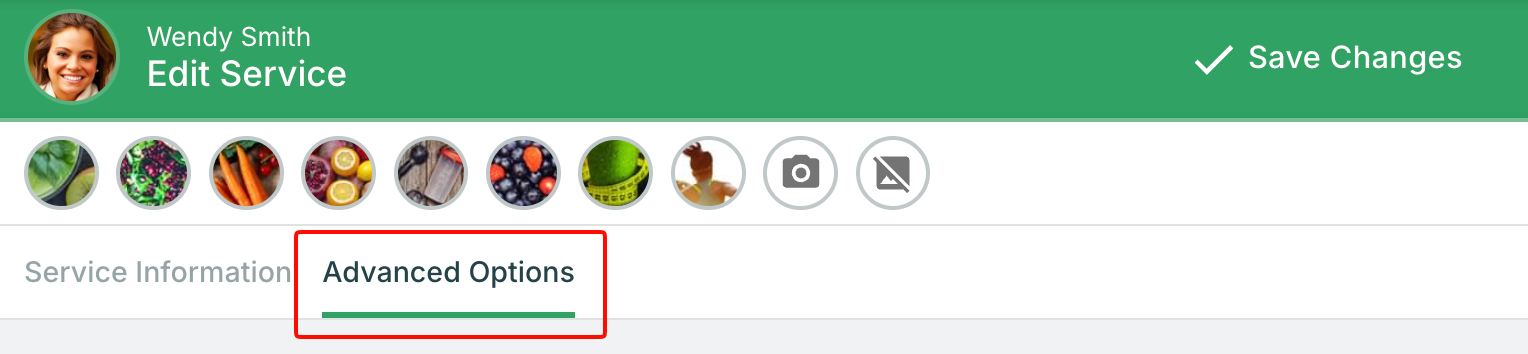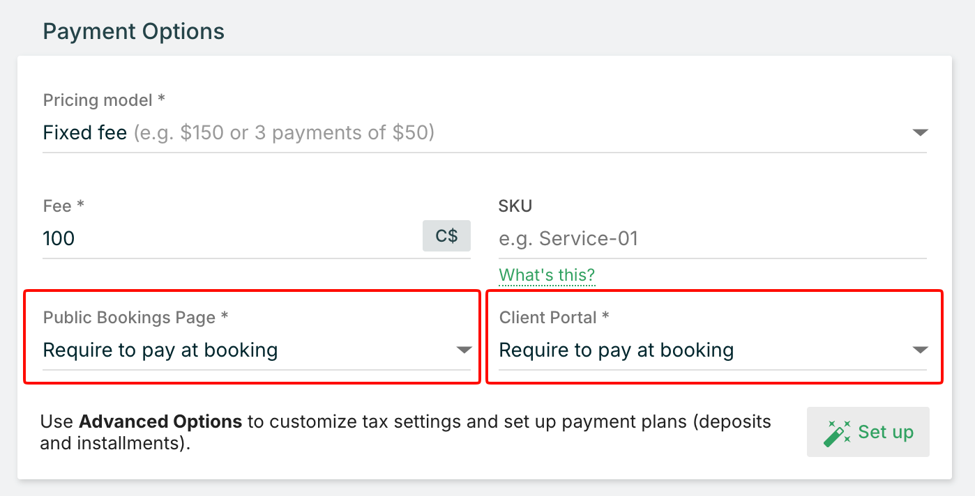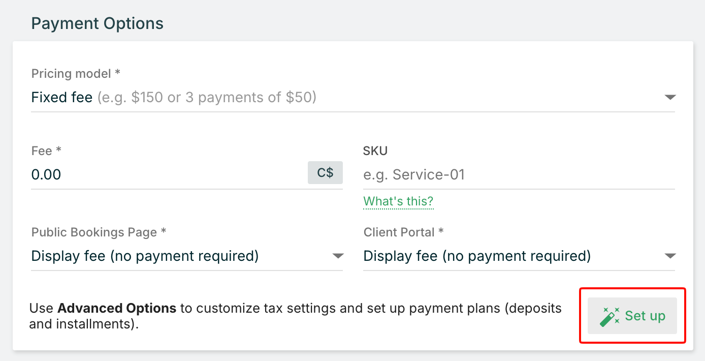 - Under Payment Options, click Set up next to the payment fields, or click the Advanced Options tab near the top of the service editing page.