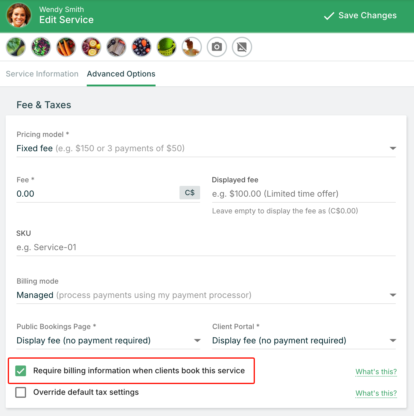 - Check the box beside Require billing information when clients book this service/package.