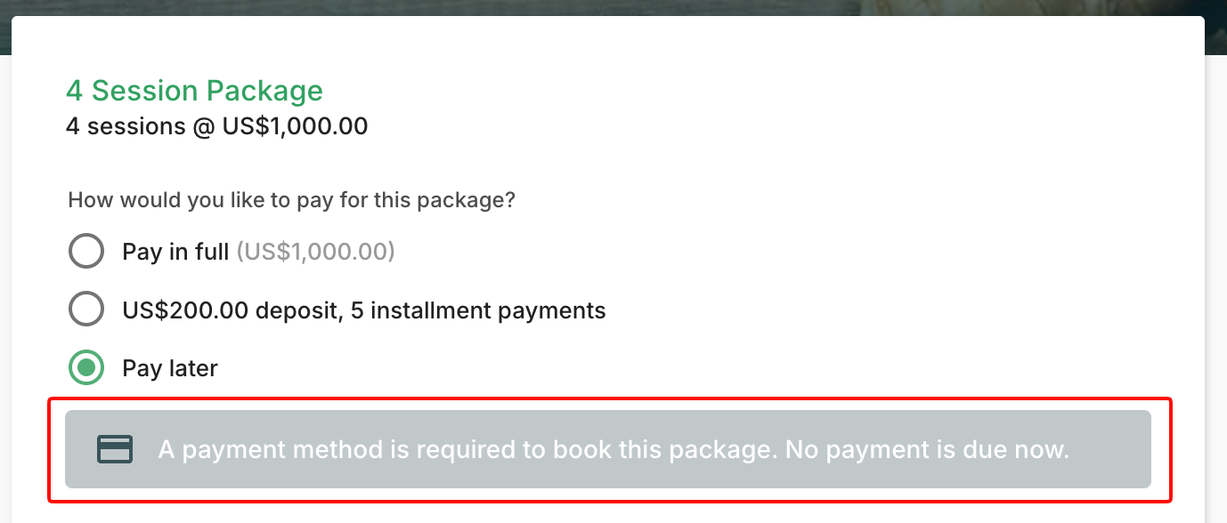 Your payment settings directly impact what clients experience when they book with you. Practice Better makes sure clients understand what's required before they complete their booking.