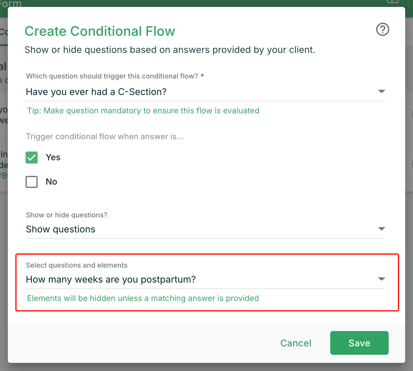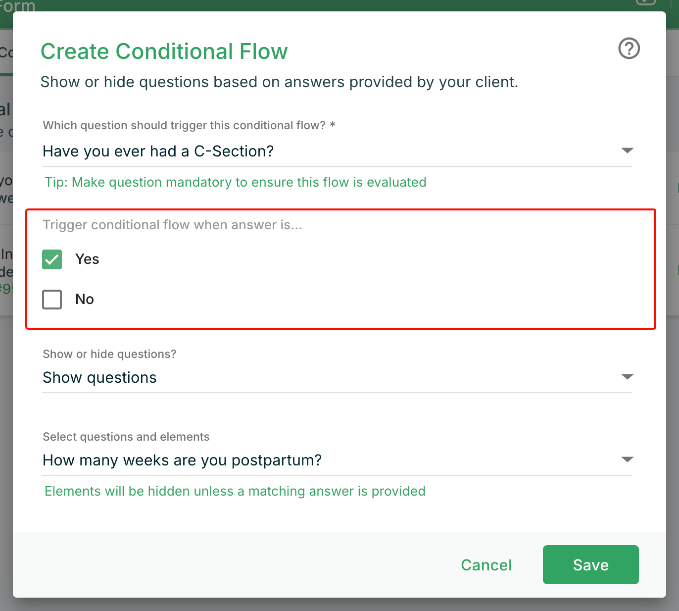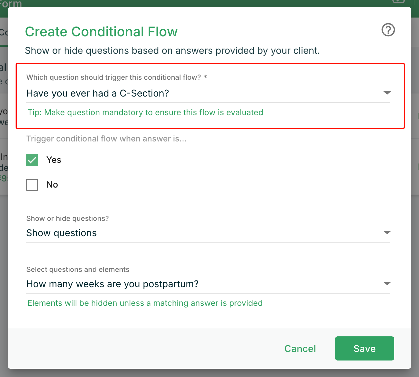 📍 Note: The popup will display a tip to make the trigger question mandatory. This ensures the flow is always evaluated when your client completes the form.