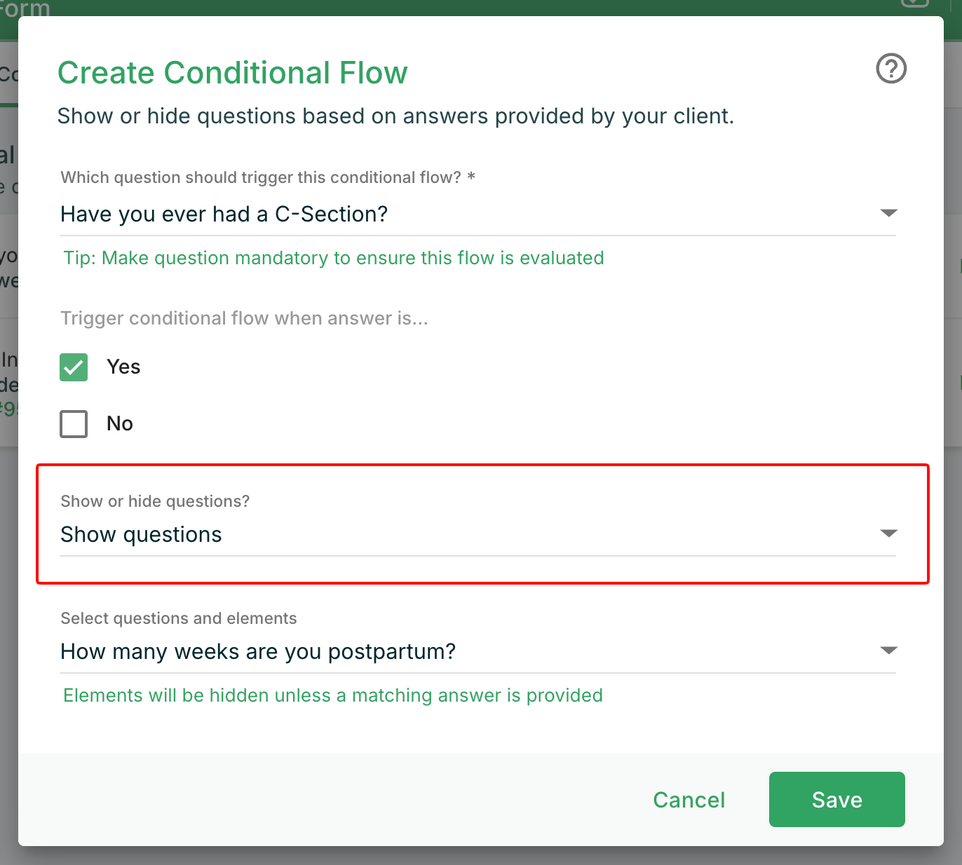 Choosing between Show and Hide determines the default state of your conditional questions — here's how each option behaves: