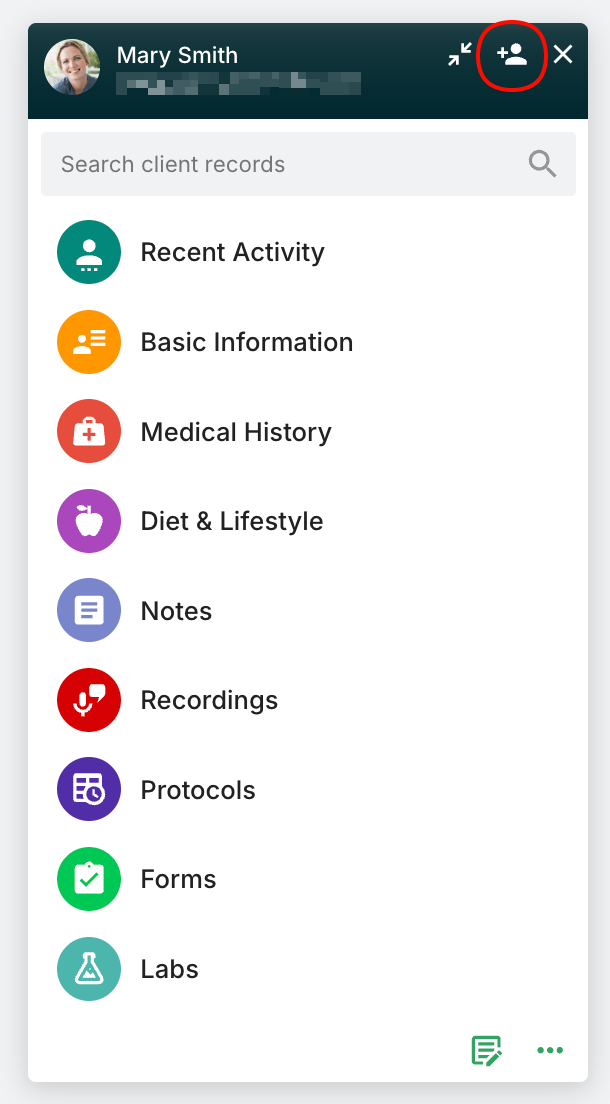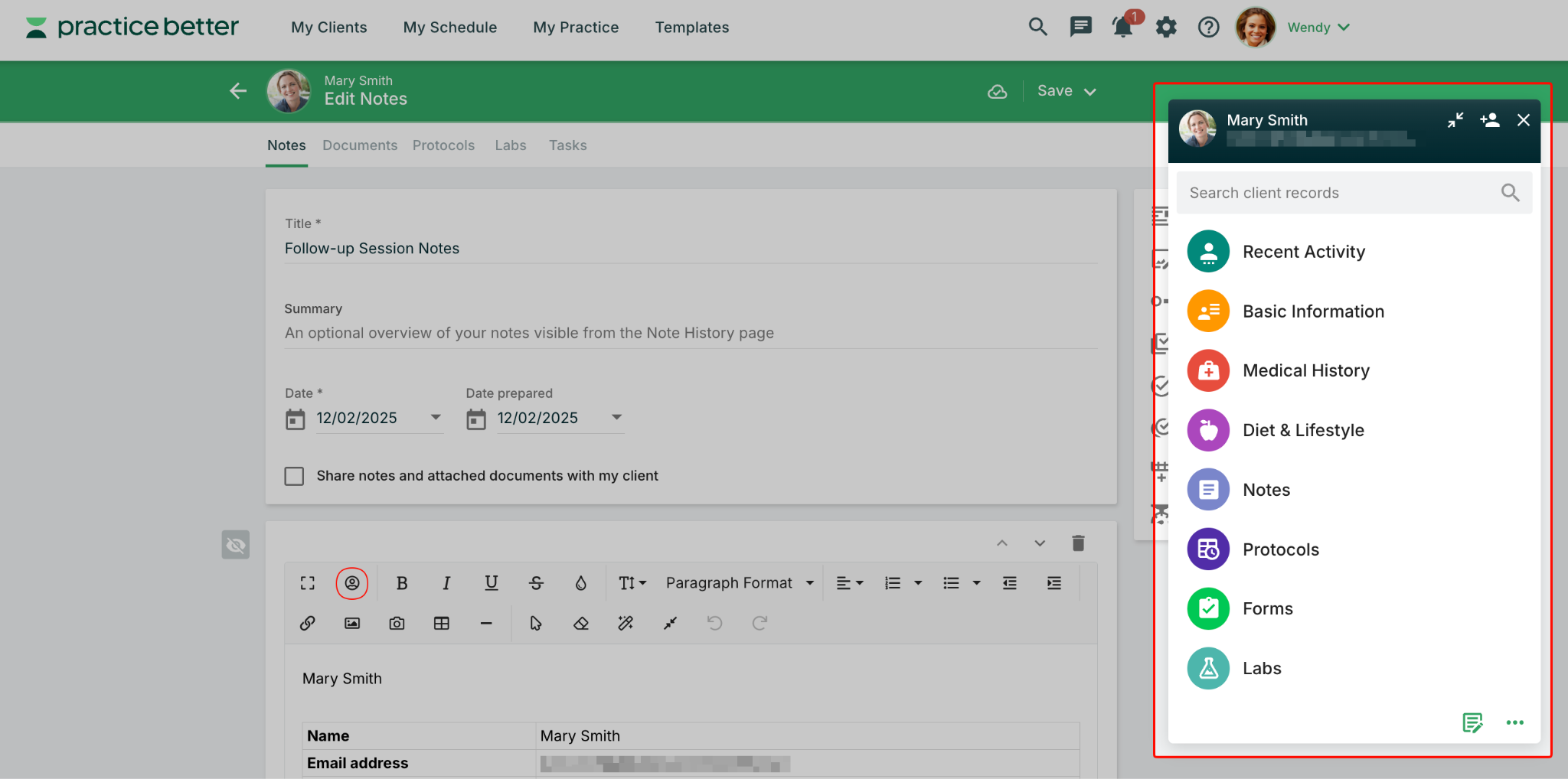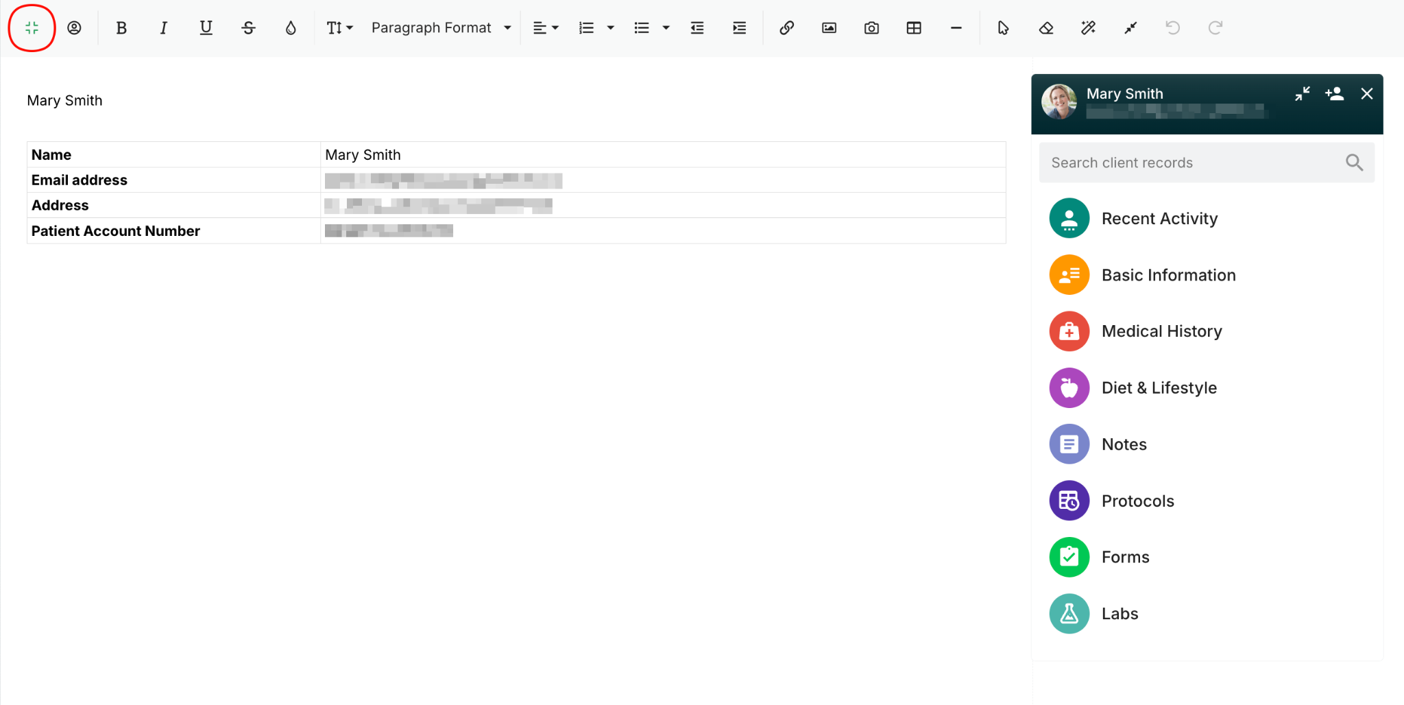 When you're working on a session note or protocol, the Client Hub icon is built right into the text editor so you can access your client's file in just one click.